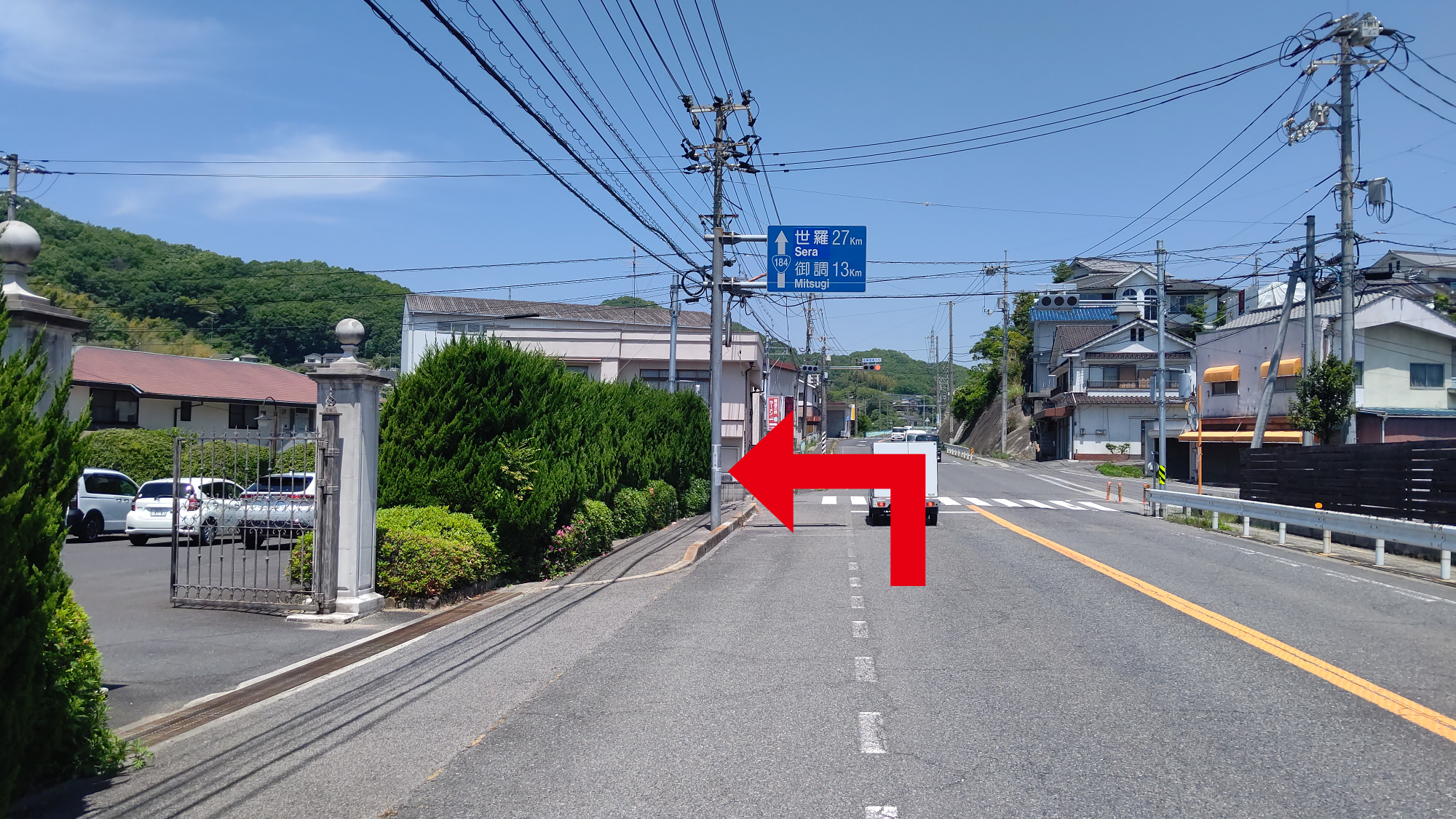 新尾道駅方面から国道184号を尾道IC方面に向かって松岡団地入口信号を左折(ラーメン一番の赤い看板手前)